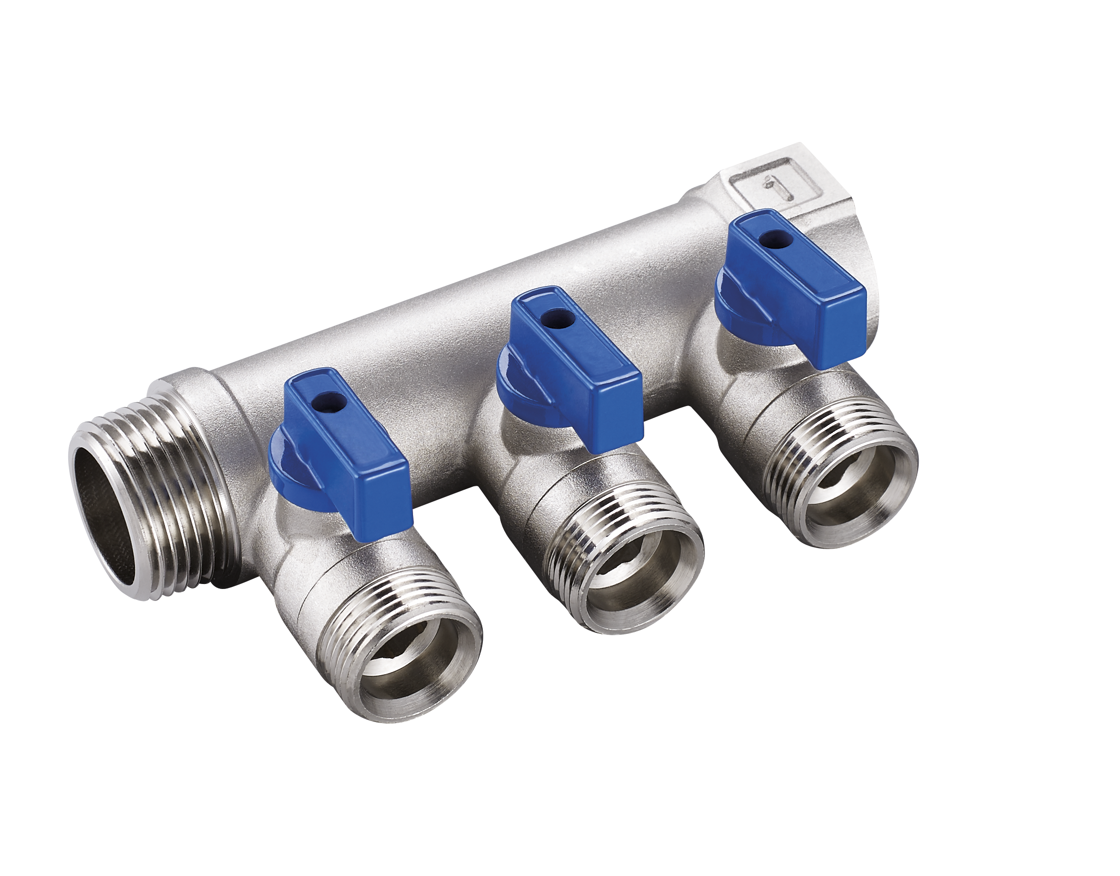 4 port 3/4" x 1/2" blue nickel plated brass water supply manifold with 3/4" connection at the inlet end and 1/2" oulet connection