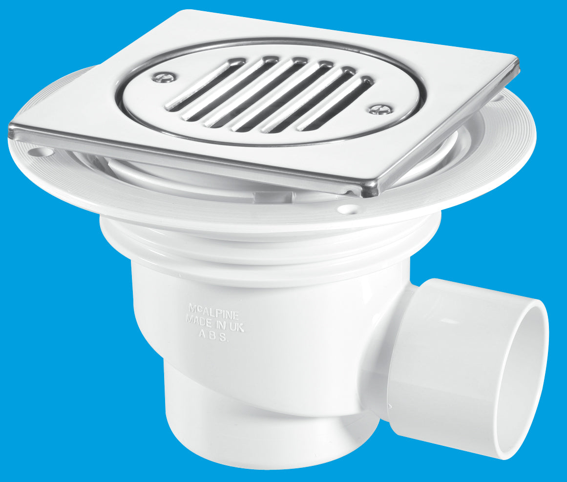 75mm Water Seal Trapped Gully: 150mm Square Polished Stainless Steel Tile with removable Grid and Securing Screws: 2" BS EN 1329-1:2000 Solvent Weld Horizontal Outlet and 2" x 1 1/2" Socket Reducer